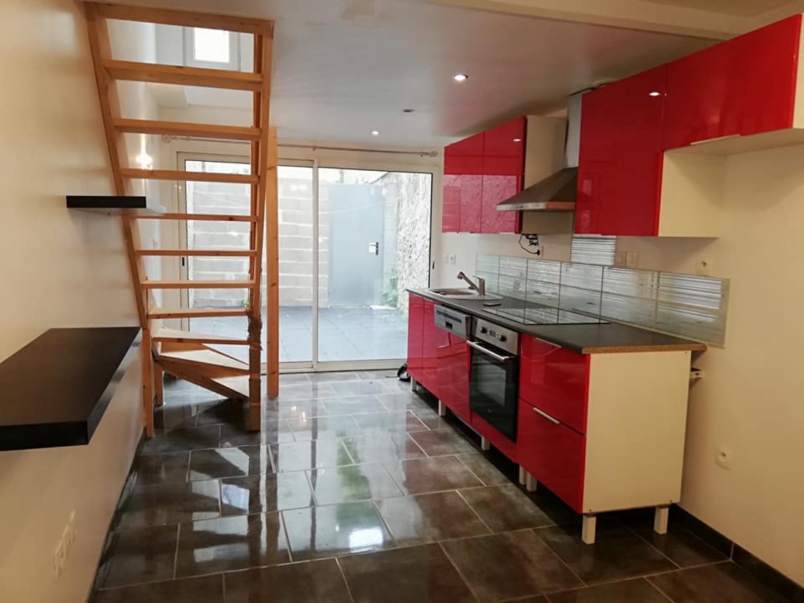RDC : garage (porte motorisée), terrasse "Patio", entrée avec placard intégré, cuisine américaine aménagée plus lave vaisselle.